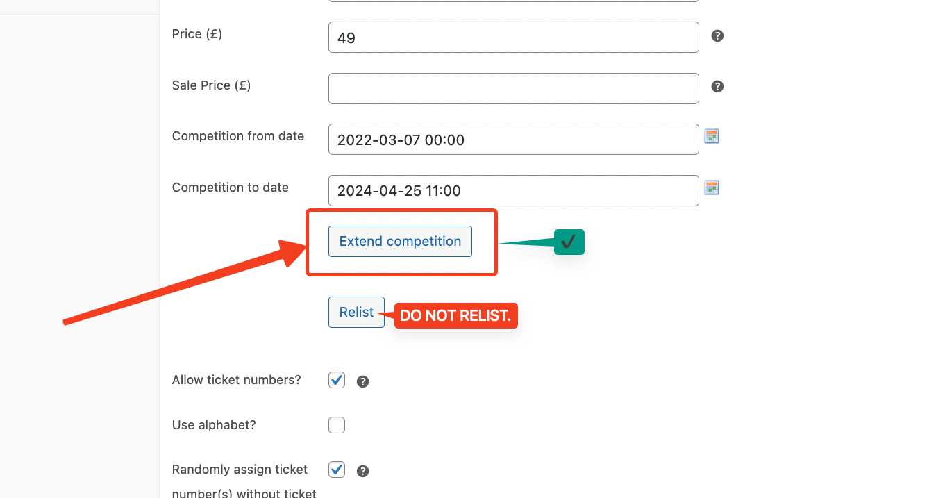 Before thinking about extending a competition - the competition first needs to fail. To fail you have to sell less than your minimum tickets.
